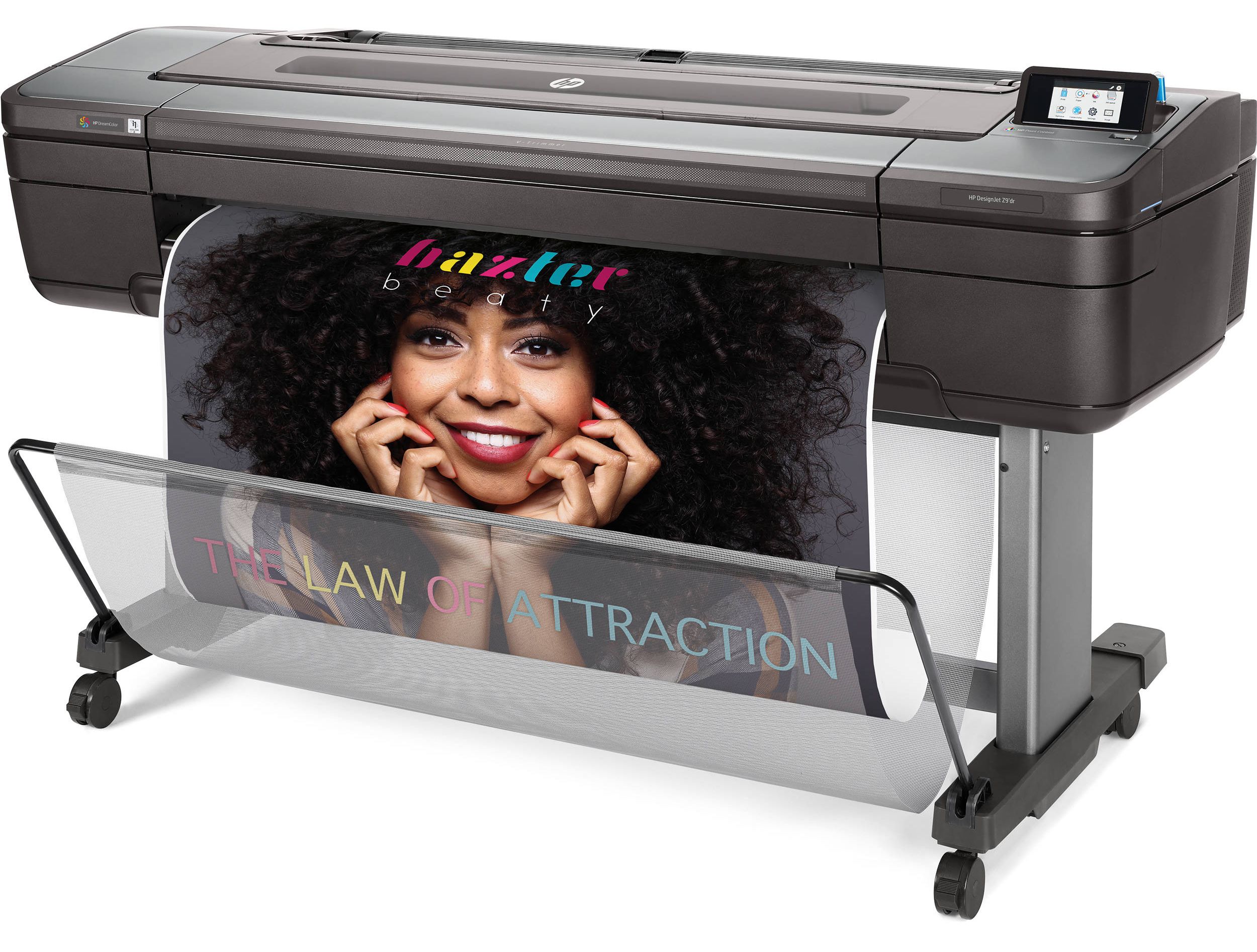 The HP DesignJet Z9 can print posters up to three feet wide on a variety of materials, including glossy, heavyweight, adhesive, and outdoor paper. Grommets are available for certain materials.